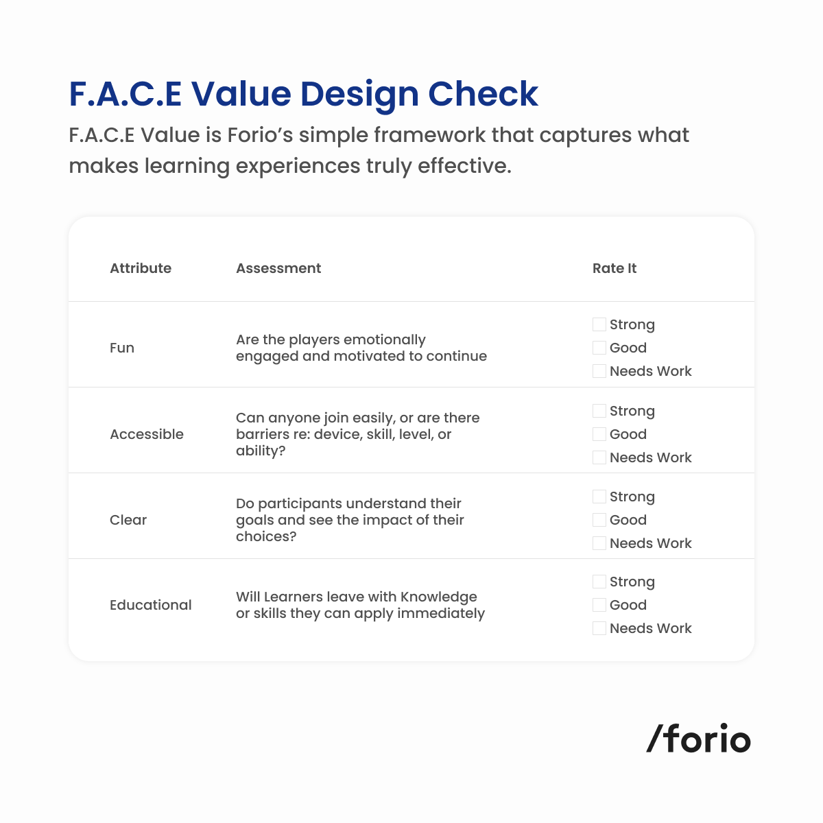 Use this F.A.C.E. Value grid as a quick design check-in for viability. Rate each attribute on a simple scale – from “Needs Work” to “Strong” – to see where your simulation delivers and where it needs refinement to inform a final iteration.